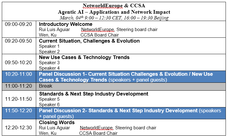 The Workshop “Agentic AI – Applications and Network Impact” will take place on the morning of the 04th March 2026, organized by NetworldEurope and CCSA. The event will have 2 components, one online and the other onsite in Barcelona with a very limited number of seats available. The respective zoom link will be available upon registration. The workshop aims to provide an open information space to share current and future views about the Agentic AI, and how this theme is being addressed by different stakeholders. Two different discussion panels are organized, addressing challenges and evolution, new use cases and technology trends as well as standardization and next step industry developments related to Autonomous Networks.